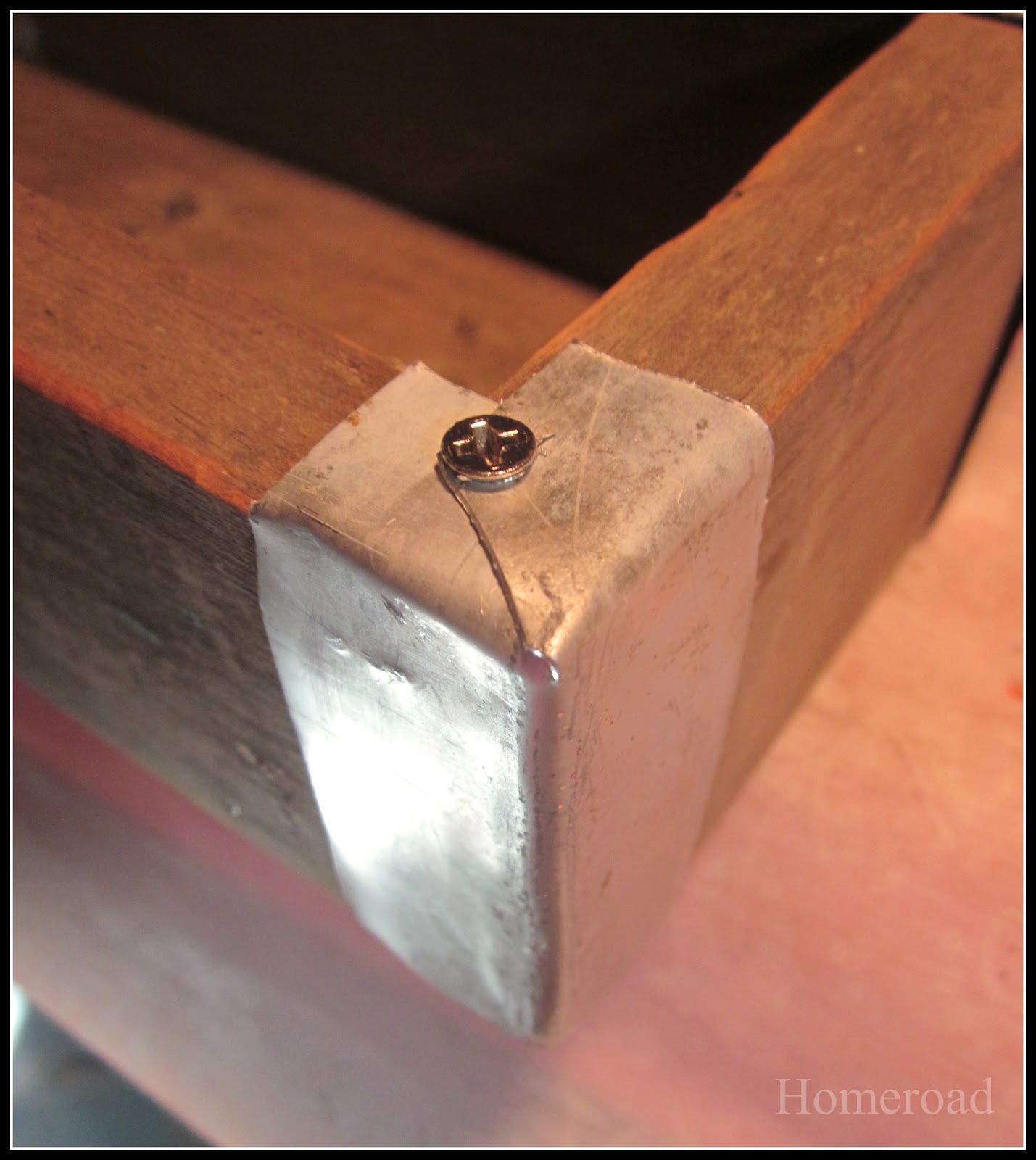 Using the corner of the wooden crate, I shaped each metal corner to the box using a hammer then screwed the metal into place.