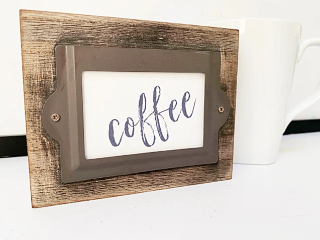 Next, I slipped the card stock coffee sign I made into the metal bracket.